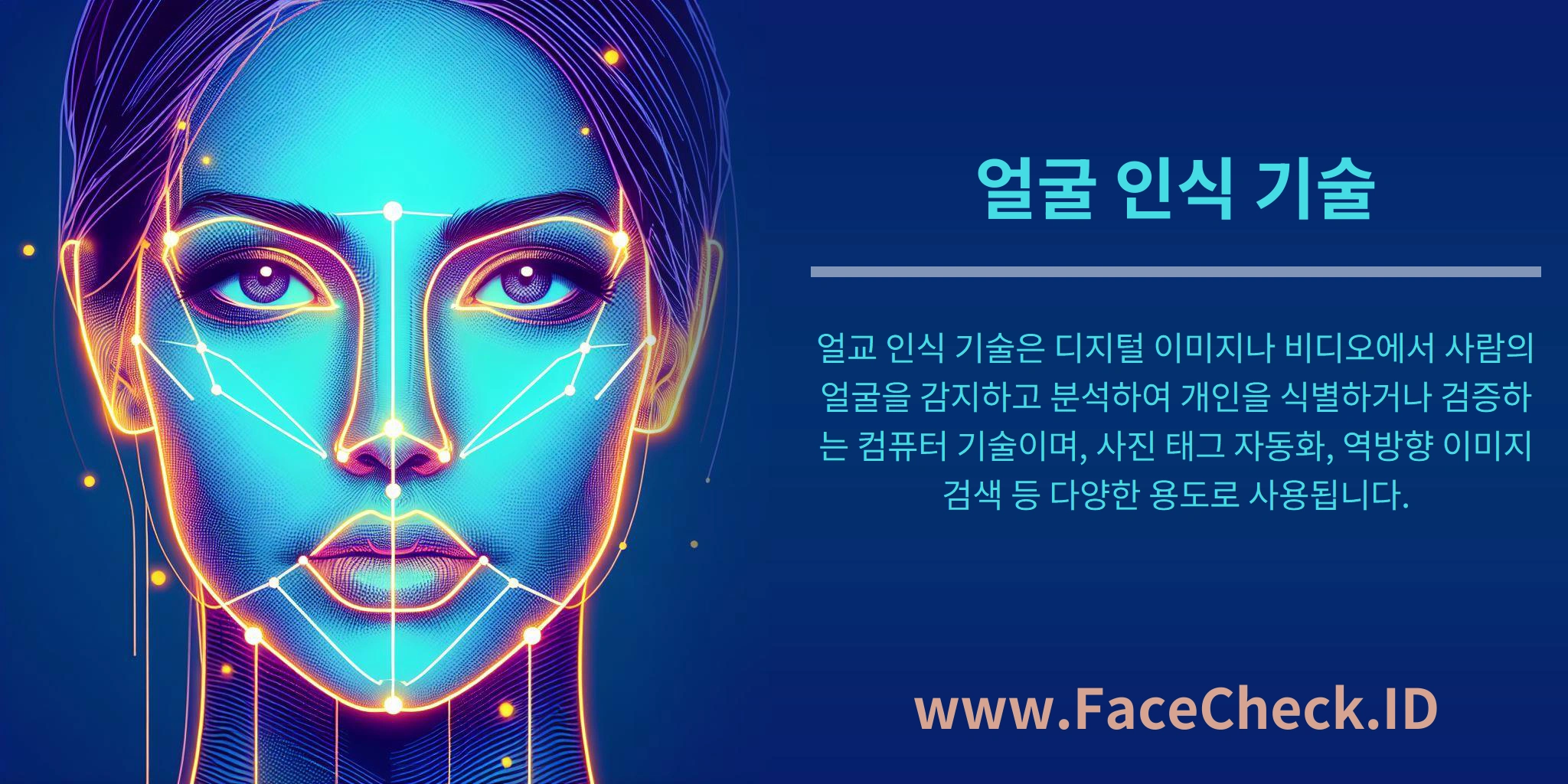 얼굴 인식 기술은 디지털 이미지나 영상(비디오)에서 사람의 얼굴을 감지하고, 얼굴의 특징을 분석해 누구인지 식별(Identification) 하거나 본인인지 확인(Verification) 하는 컴퓨터 비전 기반 기술입니다. 한국어로는 안면 인식 기술이라고도 부릅니다.